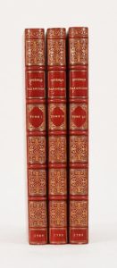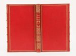RESTIF DE LA BRETONNE. INGENUE SAXANCOURT ou la femme séparée: Histoire propre à démontrer, combien il est dangereux pour les Filles, de se marier par entêtement, et avec précipitation, malgré leurs Parens. Ecrite par elle-même. Liège, et se trouve à Paris, chés Maradan, Libraire, rue des Noyers, 1789. 3 parties de 248-[4]-240-[4]-260-[8] pages reliées en 3 volumes in-12, maroquin rouge, triple filet doré sur les plats, dos à nerfs très orné, dentelle dorée intérieure, tranches dorées sur marbrure (Chambolle-Duru). Restif a dépassé dans ce roman toutes les bornes du cynisme le plus audacieux et les deux héros Jehan de Vert et Ingénue seraient, parait-il, lui-même et sa fille ainée Agnès. Unique édition «Absolument introuvable» selon Lacroix. «C'est le plus rare de tous ceux de Restif, soit que l'édition ait été détruite en bloc, soit que les exemplaires aient été recherchés systématiquement pour être détruits l'un après l'autre. L'édition entière a dû subir des retranchements et les pages 249 à 252 manquent presque toujours.» (Rives-Childs p. 308). Exemplaire non cartonné, bien complet des pages 249-252 du tome III et du prospectus de 8 pages des Provinciales qui doit bien faire partie du dernier volume. Bel exemplaire dans une condition idéale, relié par Chambolle-Duru. (Rives-Childs, 307-309) (Lacroix, pp.313-319). (Gay II, 660). Provenance: Bibliothèque Alfred Piet (ex-libris, n°311 du catalogue de sa vente de 1902).