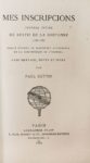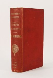 RESTIF DE LA BRETONNE. MES INSCRIPCIONS, journal intime de Restif de la Bretonne, publié d'après le manuscrit autographe, avec préface, notes et index par Paul Cotin. Paris, Plon (Bibl. Elzévirienne), 1889. 1 volume in-12, percaline rouge de l'éditeur. Seconde édition, la première en 1886 dans la revue Rétrospective. Restif considérait Mes inscripcions comme le complément indispensable du plus important de ses ouvrages: «Elles peindront mieux, dit-il, l'état de mon cœur que le plus éloquent discours». Bon exemplaire. Provenance: Ferdinand Brunetière (ex-libris).
