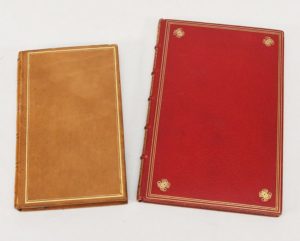 PORTEFEUILLE D'UN TALON ROUGE. Contenant des anecdotes galantes et secrètes de la cour de France. Paris, imprimerie du Comte de Paradès, 178* [vers 1780]. In-12 de 42 pages, maroquin rouge, filets dorés et chiffres dorés aux angles, dos à nerfs orné, dentelle intérieure, tr. dorées (Hardy). Edition originale de ce pamphlet d'une «violence inouïe» contre la reine Marie-Antoinette dont l'auteur est demeuré inconnu et dans lequel se trouvent des faits scandaleux qu'on ne trouve pas ailleurs. Le portefeuille d'un talon rouge dut être saisi avant même d'être mis en vente. «Toute l'édition, ou à peu près, fut parmi les livres envoyés au pilon sur l'ordre de Lenoir, le 19 mai 1783». Très bel exemplaire finement relié en maroquin. (Gay III, 821) (Tourneux IV, 21047). On joint: CORRESPONDANCE DE LA REINE AVEC D'ILLUSTRES PERSONNAGES. 1790. In-12 de 126 pages, veau blond postérieur. (Portrait manquant). Ensemble 2 volumes.