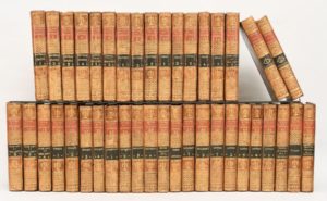 ROUSSEAU (Jean-Jacques). OEUVRES COMPLETES. Paris, Poinçot, 1788-1803. 40 volumes in-8, basane racinée, dos lisse orné, tranches dorées (reliure de l'époque). Edition collective des œuvres de Rousseau ornée d'un portrait, de 40 FRONTISPICES et 43 FIGURES hors texte de Moreau, Marillier, Monnet, Le Barbier, etc... et 13 planches dépliantes de musique. Le tome 37 renferme 319 pages de musique et d'airs gravés et le tome 38 offre 43 PLANCHES DE BOTANIQUE FINEMENT COLORIEES à l'époque par Aubry suivies des Lettres sur les ouvrages par Mme la baronne Stael-Holstein (Au temple de la vertu, 1789). La correspondance originale et inédite avec Mme Latour de Franqueville et M. Du Peyrou. Paris, Giguet et Michaud (1803) forme les 2 derniers volumes (dos très légèr. différents). Pages brunies sur les 5 volumes de lettres, petits défauts, l'exemplaire est plaisant. (Tchémerzine V, 568).