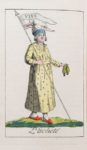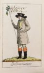 [BARRUEL-BEAUVERT (J. de): CARICATURES POLITIQUES. Sans lieu ni nom, An VI (1797). Plaquette in-12 de 18 pages, percaline violette, couv. jaunes muettes conservées. Seule édition rare, de ce pamphlet satyrique anti-révolutionnaire orné de 5 figures gravées coloriées à l'époque, illustrant 5 classes de républicains: L'indépendant, L'exclusif, L'acheté, L'enrichi et le Systématique. Joseph de Barruel-Beauvert (1756-1817) ardent royaliste, un des rédacteurs des Actes des Apôtres, écrivain, fut emprisonné au Temple et déporté en Guyane. Pas dans Barbier. Dos décoloré.