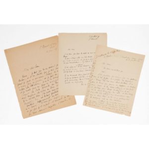 JACOB (Max). 3 LAS à son ami le peintre Jean Lachaud, janvier-juillet 1939, Saint Benoît sur Loire. 4 pages in-folio. - 6 janvier 1939. 2 pages in-folio. Il évoque sa foi : "La seule formule du bonheur est une confiance illimitée en Dieu à la condition qu'on cherche Dieu (...). Il nous fait souffrir quand il le faut et pas plus qu'il ne faut : il connaît la dose que nous sommes capables d'absorber et force la violence pour les gens et les nations qui ont perdu la sensibilité ou ne l'ont jamais eue. (...) Je te souhaite de demander au ciel d'augmenter ta foi. (...) tous les grands esprits ont cru en Dieu même Voltaire." - 1er 1939 : 1 page in-folio, au sujet de la préparation d'un voyage dans sa Bretagne natale, Quimper. Pour ces "joyeux projets", il compte passer à St Brieuc chez son ami Louis Guilloux, puis "je partirais pour Brest bientôt (dans le cas où la sœur-Anne-au-bon-cake et toi vous seriez dans cette chère ville), je vous demanderais alors une ou deux tasses de thé et je partirais vers la verdoyante côte de ma naissance." - puis le 5 juillet, il précise ses obligations de visite pour ce même voyage : son "confrère très ami [qui] ne me laissera pas partir tout de suite et nous avons beaucoup à dire. Je me demande donc quand je serai libre. Mais je te préviendrai à l'avance de façon que tu puisses me répondre."