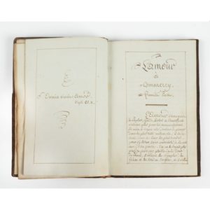 MANUSCRIT. - ANONYME. L'Amour à Commercy. 1807. In-8 (14 x 21,5 cm), XII pp., (1) f. de titre, 114 pages avec filet d'encadrement à chaque page, veau raciné, avec grecque encadrant les plats, dos lisse orné (Rel. époque). Manuscrit littéraire joliment calligraphié. Composé dans un style néo-classique s'inspirant de la mythologie, ce roman allégorique en deux parties, s'adresse "aux belles" de cette commune de la Meuse, en Lorraine. Avec 2 feuillets manuscrits volant, identifiant les noms. Coutures lâches, des feuillets détachés. Petit accroc aux marges. Premier plat insolé.