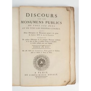 LUBERSAC (Charles-François de). Discours sur les Monumens publics de tous les âges et de tous les peuples connus. Paris, Imprimerie Royale, 1775. In-folio, broché. Édition originale, illustrée d'un très beau frontispice d'après Monet et 2 grandes planches dépliantes représentant le monument à la gloire du Roi, qui ne sera pas édifié. Ex-libris ancien Claude Clermontet. Dos refait, brochage fragile, galeries de vers, rousseurs, salissures et froissements aux premiers et derniers feuillets.