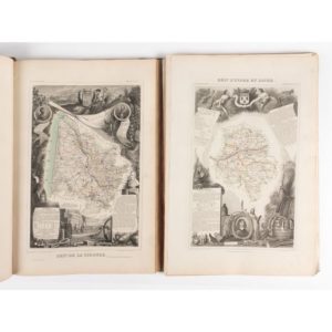 ATLAS. - LEVASSEUR (Victor). Atlas national illustré. Paris, Combette, 1852. In-folio, demi-basane fauve (Rel. ép.). Nouvelle édition de ce célèbre atlas très ornementé, contenant 101 feuillets : un titre gravé, un tableau statistique d e la France et ses colonies, une carte de la France en 1852, 92 cartes des départements et colonies, un planisphère, et 6 cartes pour les continents. Contours coloriés, très beaux encadrements gravés avec tableaux descriptifs. In-fine, une "Nouvelle carte de la France" par Charle, 1851, sur double-page. Rousseurs et salissures. Premier plat détaché. Joint du même : [LEVASSEUR (Victor). Atlas national illustré. Paris, Combette, 1849]. 100 cartes volantes : 92 cartes des départements et colonies, un planisphère, une carte de la France en 1852, et 6 cartes pour les continents.