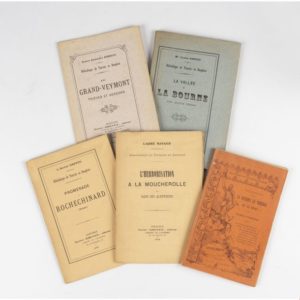 BIBLIOTHÈQUE DU TOURISTE EN DAUPHINÉ. [Extrait du Journal du Dauphiné]. Grenoble, Xavier Drevet, 1875-1880. Réunion de 5 vol. In-8, brochés, non rognés, sous chemise maroquinée brune et étui modernes. RAVAUD (Abbé). L'Herborisation à La Moucherolle et dans ses alentours. 1875. DREVET (Xavier). Promenade à Rochechinard. 1877. DREVET (Louise). La Vallée de la Bourne. 1878. 4pl. dépliantes. BIBESCO (Prince Alexandre). Le Grand-Veymont. Trièves et Vercors. 1880. DESBOIS & DESROCHES. Excursions dans le Royans, le Vercors, et le Diois. s.d. Expert : Ségolène Beauchamp