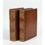 CROKE (Sir Alexander). The Genealogical history of the Croke family, originally named Le Blount. Oxford, W. Baster for John Murray, London, and Joseph Parker, Oxford, 1823. 2 forts vol. in-4, veau fauve, encadrement à froid, dos orné, tranches marbrées (Rel. anglaise de l'ép.). Édition originale, contenant 18 tableaux généalogiques hors-texte, dont certains dépliants, et de nombreux blasons et armoiries in-texte. Arrivé en Nouvelle-Ecosse en 1801, Alexander Croke (1758-1843) siégeait à la cour de l'amirauté d'Halifax. Exemplaire offert par l'auteur à George Rowland Minshull, avec ex-dono et lettre a. s. Ex-libris du XXe s. : James Montgomery Byng Wright, avec son timbre sec. Quelques rousseurs. Dos refait, reliure restaurée. Tome II, second plat détaché.