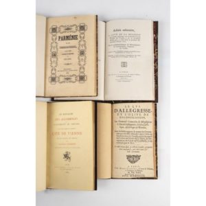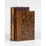 DIVERS. - VIZILLE (Monseigneur le connestable, Seigneur de). Advis salutaire à ceux de la religion prétendue réformée sur la bénédiction du temple de Vizille & de la première messe qui y a esté dicte le premier dimanche d'aoust 1622. Paris, Jouaust, 1873. In-8, demi-maroquin brun à coins, dos à nerfs orné, non rogné, couv. cons. (Rel. du XIXe s.). Réimpression de l'édition de Paris, Denys Langlois, 1622. Deuxième ouvrage de la collection "Pièces rares et curieuses relatives à l'histoire du Dauphiné publiées sur les originaux avec des éclaircissements et des notes, par trois bibliophiles dauphinois". Tirage à 50 exemplaires. Un des deux exemplaires de tête sur Chine. Ex-libris Bibliothèque Mr Roman. On joint : - LE LYS d'allégresse et l'olive de réconciliation sur l'heureuse conversion de Monseigneur le Duc de Lesdiguières, À la fois catholique, apostolique et romaine. Paris, Denys Langlois, 1622. In-12, demi-maroquin brun, dos à nerfs (Rel. du XIXe s.) Rare opuscule. - CHAMPIER (Symphorien). Du royaume des Allobroges avec l'Antiquité et origine de la très noble et ancienne cité de Vienne sur le fleuve du Rhosne. Lyon, Henri Georg, 1884. In-12, demi-maroquin bordeaux à coins, dos à nerfs, tête dorée, couv. cons. (L. Magnin). - CLERC-JACQUIER. Parménie et vicissitudes. 633-1850. Grenoble, Maisonville, 1854. In-12, demi-veau fauve, couv. cons. (Rel. ép.). Expert : Ségolène Beauchamp