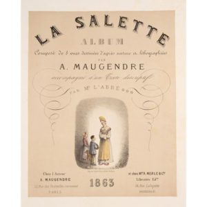 MAUGENDRE (A.). La Salette. Album composé de 8 vues dessinées d'après nature et lithographié. Paris, chez l'auteur, 1863. In-folio, demi-toile brune, cartonnage illustré, chemise et étui modernes. Édition originale de cet album ouvrant sur deux états de la page de titre, lithographiée en couleurs, et différenciés par les adresses, et 8 lithographies montées sur onglets ; suivent 23 pages d'un texte descriptif. L'apparition de La Salette date de septembre 1846. Petites rousseurs. Gardes renouvelées. Expert : Ségolène Beauchamp