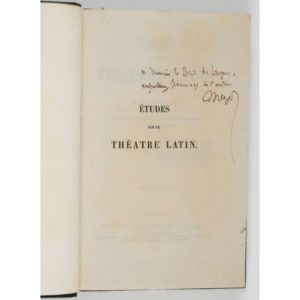 MEYER (Maurice). Études sur le théâtre latin. Paris, Dezobry, E. Magdeleine & Cie, 1847. In-8, demi-veau vert, dos lisse orné (Rel. lég. postérieure). Édition originale. Envoi a. s. de l'auteur au Duc de Luynes sur la faux-titre. Ex-libris armorié Dampierre. Frottements, un mors fendu.