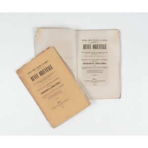 [ORIENT]. - Revue Orientale ; ou Recueil des matières politiques, religieuses, littéraires, artistiques, scientifiques, commerciales, etc…, le tout considéré sous le point de vue du Maintien de l'équilibre européen résultant de la régénération de l'Empire Ottoman. Paris, Au Bureau de La Revue Orientale, 1841. 2 vol. in-8, brochés, non rognés. Réunion du Prospectus-Spécimen (48 pp.), et de sa suite (93 pp., n° 1 ?). Cette rare revue, fondée par le docteur Louis-Gaspard Barrachin (1791-1854), est consacrée au Levant, à l'Empire ottoman et à l'équilibre européen. "Ce que nous voulons en définitive, et bien positivement, c'est la conservation de l'Empire ottoman par l'affranchissement, selon les conditions que nous avons dites, des populations chrétiennes et israélites d'Orient.", p. 31 du Spécimen. Ces fascicules parurent en même temps que la "Revue orientale" éditée à Bruxelles par Eliakim Carmoly. Mouillures.