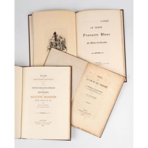 PATOIS. - VELLEIN (G.). Le poète François Blanc dit Blanc-la-Goutte. Grenoble, Allier, 1907. In 8, bradel, demi-maroquin brun, cartonnage moderne rouge, couv. cons. Gravure en frontispice. Tirage à 120 exemplaires. Envoi a. s. de l'auteur. On joint : - ROCHAS (Adolphe). Notice bibliographique et historique sur Auguste Boissier, poète patois de Die. Grenoble, Joseph Allier, 1887. In-8, bradel, cartonnage moderne rouge, pièce de titre rouge, couv. cons. - TAILLANDIER (A.). Notice sur la vie et les travaux de M. Berriat Saint-Prix. Paris, Imprimerie Duverger, 1846. In-8, 36 pp., bradel, cartonnage moderne, pièce de titre bleu. De la bibliothèque Paul Couturier de Royas, avec deux ex-libris. Quelques rousseurs. Expert : Ségolène Beauchamp