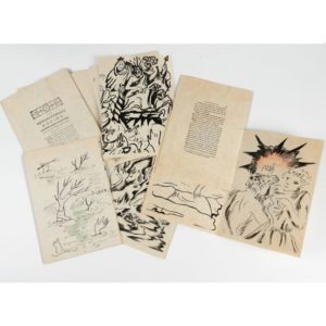 LIVRE D'ARTISTE. - [OVIDE. Les Métamorphoses. Illustration collective]. In-8, chemise à rabat de velours bleu, anneaux de laiton. La reproduction du "Livre premier" (42 pp.) de cette édition du XVIIIe (édition de Leclerc, 1767 ?) est accompagnée de 44 belles illustrations modernes, non signées, à pleine page reproduites en noir - dont 3 sur double page, et certaines rehaussées à l'aquarelle - et diverses illustrations dans les marges du texte. Plusieurs artistes sont intervenus pour cette illustration et la variété des styles est intrigante. Un plat de la chemise en partie détaché.