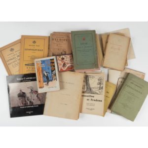 LOT - Carton de 20 volumes divers, XXe, vendu en l'état : - Binet (Alfred). L'Etude expérimentale de l'intelligence. Paris, C. Reinwald, Schleicher Frères & Cie, 1903. In-8, broché. E.O. - Le Goff. Journal des neiges. Le Hasard d'être (planche volante ajoutée). - Drouillet (Jean). Sonnailles et Fredons ; Poésies en parler d'Amognes. La Charité-sur-Loire, Editions A. Delayance, 1948. In-8, broché. Couverture et vignettes d'André Ledieu. 1 / 40 ex. numérotés sur Vélin. - CAMPOREALE (Sergio). Portraits de famille. Paris, Galerie de Francony, 1989. Envoi à Bernard et Régine Cathelin, avec un dessin original. - HARCINY. Le ver dans la plaie. - DARLE. Le Feu de chèvrefeuille. - MAUMENÉ. Nouvelle Méthode de Culture Forcée des Arbustes et des Plantes soumis à l'action de l'éther et du chloroforme. Paris, Lib & Imp. Horticoles - 1903. Déchirures. - [Hannon Théodore / Frère Culpidon]. Le Mirliton Priapique. (Bruxelles, Henri Kistemaeckers), 1883. In-8 débroché. - Marienbad und Ungebung. [Guide Allemand]. Leipzig, Woerl's Reisebücher, 1907. - MARCEL (Étienne). Les Jours sanglants. - CYL (LUC). Le beau chanteur du Bonis's bar. Envoi de l'auteur. - GAVEAU (Galerie). Le Triomphe du figuratif. - DUBUFE (Guillaume). Nuits blanches. Suite sur satin et japon. - BIESTEGUI. En Chine. Paris, Imprimerie de Vaugirard, 1920. Très rare œuvre de jeunesse du grand collectionneur et décorateur et organisateur du " Bal du Siècle " à Venise. Mouillure affectant la couverture et le faux-titre. - CHINE. Flowers in the mirror story. 1982. - [Militaria] - BOTTARD (Ernest, Ancien élève de Polytechnique) - Questions Militaires. Châteauroux, Imprimerie A. Majesté, 1882. In-8 broché. - [Congo Belge]. - LESIGNE. Nouveau Plan de Léopoldville. - Carte du Congo Belge et du Ruanda-Urundi. - Bruxelles, Editions Lesigne, s.d. - Carte dépliante. Le Maroc économique. 1919. - Nouvelle carte d'Europe dressée par Berthe.