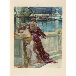 LOUYS (Pierre). Aphrodite. Paris, Association et Cercle Grolier fondée par Charles Meunier, 1932. In-4, en feuilles, sous couverture rempliée. 4e ouvrage édité par la société fondée par Charles Muenier. Édition de luxe hors commerce, illustrée de 33 compositions hors-texte en couleurs, sous serpentes légendées, de Paul Gervais ; elles ont été gravées en fac-similés d'aquarelles par Louis Macard et mises en couleurs par Edmond Vairel. Tirage à 200 exemplaires ; celui-ci avec une suite des planches en noir, la liste des membres et un spécimen de l'écriture de l'auteur. Minimes rousseurs.