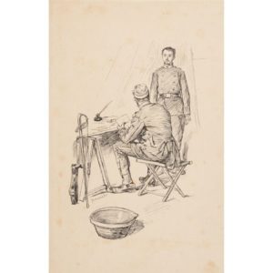 MIRBEAU (Octave). Le Calvaire. Paris, Libraire Paul Ollendorff, 1901. In-8, demi-maroquin brun avec coins, dos lisse orné d'un décor mosaïqué dans les tons de bruns, de deux branches, dont une fleurie, enlaçant une croix, tête dorée, couv. et dos cons., étui moderne (David). Illustrations de Pierre Georges Jeanniot. Un des 20 exemplaires sur Japon ancien, avec une suite des illustrations sur chine, celui-ci n° 20. Joint un dessin original à la plume signé de Jeanniot (245 x 160 mm, avec rousseurs), la couverture pour l'édition illustrée au format in-12, conservée dans son intégralité, et une épreuve avant la lettre du premier plat de cette couverture. Ex-libris JCD et Dr R. Ravaud.