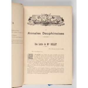REVUE (Petite) des Bibliophiles Dauphinois. 15 volumes. - Petite revue dauphinoise bibliographique et littéraire. Voiron, Baratier et Mollaret, 1886-1892. 6 volumes in-8, demi-maroquin brun, dos à nerfs orné d'un dauphin répété (Rel. ép.). - Petite revue des Bibliophiles Dauphinois. Grenoble, Joseph Allier, 1905-1915. 4 volumes in-8, demi-maroquin vert à bande, dos à nerfs (Rel. moderne). - Petite revue des bibliophiles Dauphinois. Deuxième série. Grenoble, Joseph Allier, 1921-1966. 5 volumes in-8, demi-maroquin bordeaux à coins, dos à nerfs orné, couv. cons, rel. moderne. On joint : REVUE du Dauphiné et du Vivarais. Vienne, Savigné, 1877-1881. 5 volumes in-8, bradel demi-percaline brune, pièce de titre rouge, couv. cons., non rogné (Rel. moderne). Recueil mensuel historique, archéologique et littéraire, illustré de gravures hors-texte. Ex-libris Charles Jaillet. Expert : Ségolène Beauchamp