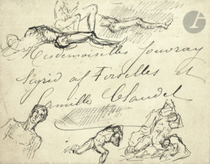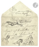 Dans les marges du recto, Alfred BOUCHER a dessiné à la plume et à l’encre noire 6 croquis : de hommes allongés, un assis, un buste d’homme, un personnage s’agenouillant, et un groupe ; au dos, trois études de femme nue.
