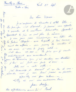 Jean DUFY (1888-1964). — 6 L.A.S., Preuilly-sur-Claise 1950-1951, à Mme Yvonne Bourgeois ; 7pages formats divers, enveloppes.