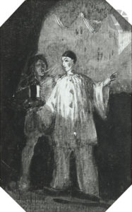 Scène nocturne de théâtre : un Pierrot est éclairé par un homme portant une lanterne.