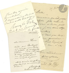 Bel ensemble de lettres de sculpteurs, peintres et critiques d’art, adressées au sculpteur. Auguste-Jules Boussaton (2), Auguste Cain (3), Pierre-Louis Deffès, Henri Delaborde (3), Paul Desachy, Devillers, Henri-Patrice Dillon, Alfred des Essarts, Émile Feugère des Forts, Adolphe Fumière, Ferdinand Heilbuth, Ernest Hillemacher, Henry Jouin (7), Baron Maxence Le Febvre, Joseph Magrou, Eudoxe Marcille (2), Claudius Marioton, Jean Mora, Julien Moulin, Charles Ravaisson-Mollien, Louis Rochet, François Truphème, Charles Wable, Adolphe Yvon (2).
