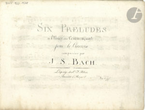 Johann Sebastian BACH (1685-1750). — Six Préludes à l’Usage des Commençants pour le Clavecin (Leipzig, C.F. Peters, [ca 1814]) ; oblong in-4 de 7pages, broché, couv. de papier fort gris avec étiquette de titre ms.
