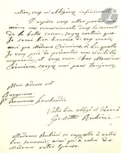 Giuditta PASTA (1797-1865, soprano). — Londres 17 octobre 1827 (1 p. in-4 en italien, adr.), à M. Fiore, parlant de sa fille Clelia, qui a recouvré la santé et est sauvée ; elle est donc une mère heureuse ; Laurent va devenir l’impresario du...