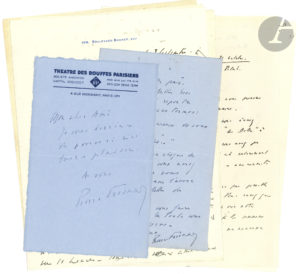 Pierre FRESNAY (1897-1975). — 7 L.A.S., [vers 1935-1937], à Maurice Sachs ; 8 pages in-4 à son adresse, et 2 p. in-8 (une à en-tête Théâtre des Bouffes Parisiens).