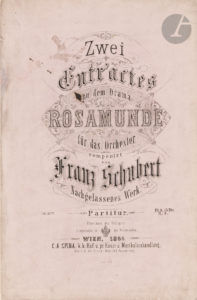 Franz SCHUBERT (1797-1828). — Zwei Entr’actes zu dem Drama Rosamunde für das Orchester (Wien, C.A. Spina, 1866) ; grand in-8 de 71 p., cartonnage moderne avec les couvertures roses d’origine contrecollées.