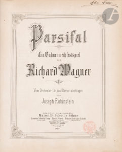 Richard WAGNER. — Parsifal. — Ein Bühnenweihfestspiel. Vom Orchester für das Klavier übertragen von Joseph Rubinstein (Mainz, B. Schott’s Söhne, [1882]) ; in-fol. de 2 ff., 261p. lithographiées ; reliure de l’époque demi-chagrin brun à...