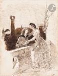12 dessins par Louis Boulanger (2 dessins à la plume : dame assise, Roméo et Juliette), Victor Hugo (caricature à la plume, légendée : «Qu’avez-vous à répondre à cela?»), Charles Wissant (paysage), et anonymes, ou d’après Charlet ou Raffet.