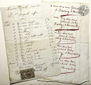 – Une page avec cinq essais de dédicaces à l’encre rouge de Barbey d’Aurevilly à son ami Gabriel Delas, par Louis Yver [fondateur du Musée Barbey d’Aurevilly, et auteur de fausses dédicaces].