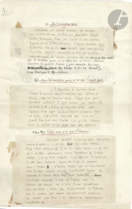 Intéressante étude philosophique en 11 paragraphes, suivis de 7 notes. Le manuscrit, préparé avec soin pour l’impression, avec quelques ratures et corrections, se présente sous forme de fragments découpés et collés sur de grandes pages ; chaque paragraphe est numéroté, et son titre souligné à l’encre rouge.