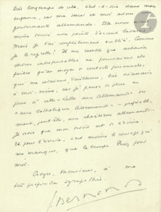 Il a été très occupé depuis son retour de Suisse, «car j’ai neuf personnes avec moi, enfants et petits-enfants, c’est un grand travail que de déplacer tout ce monde». Il évoque son séjour en Allemagne où il était invité par le Général Koenig. «Peut-être pourrez-vous vous procurer le numéro du 18 septembre de la Bataille, où j’ai fait allusion au caractère universel du drame allemand, ce qui m’a valu, bien entendu, les injures de la presse russe de langue française à Paris. Rien n’est plus urgent, pour l’avenir et la paix du monde – si le monde a encore un avenir – que de rassembler et de sauver les débris de la vieille chrétienté allemande. En la laissant se damner, nous nous damnerons avec elle. J’ai parlé jadis l’allemand, il y a très longtemps de cela, c’est à dire dans mon enfance, car ma sœur et moi avions une gouvernante allemande. Elle nous avait même donné une pointe d’accent bavaroi! […]. Il me semble que certaines choses indispensables ne pourraient être faites qu’au moyen de contacts personnels, qui me seraient, d’ailleurs, bien nécessaires à moi-même, car je pense de plus en plus à cette “Lettre aux Allemands” ou “aux catholiques allemands” – préférablement, peut-être, aux chrétiens allemands… Je crois que mon devoir est de l’écrire. Et pour l’écrire, c’est moins le courage qui me manque, que le temps. Priez pour moi»...