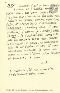 Puis il résume l’affaire de la note de Caillois, «dont les études sont d’une intelligence admirable», et ajoute : «il ne me semble pas que les grands compliments qu’il vous arrive d’adresser dans le privé à certains de nos collaborateurs compensent tout à fait la façon déplaisante dont il vous est arrivé, à plus d’une reprise, de parler en public (ou même en privé) de la nrf. Je veux bien que ç’ait été, le plus souvent, en état d’ivresse (je ne l’entends pas du tout en mauvaise part ; l’ivresse est une part de la vie, non la plus négligeable.). Seulement, je ne vois pas du tout pourquoi l’ivresse ne vous jetterait pas, à l’égard de la nrf actuelle, dans l’enthousiasme excessif, aussi bien que dans la malveillance excessive. Et je désire, en tout cas, que vous choisissiez : ou bien de collaborer à la nrf (& de l’aimer), ou bien de rompre toutes relations avec elle, et avec moi»... Il ne peut admettre qu’il cafarde comme il l’a fait auprès de Gaston Gallimard...