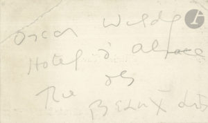 Au dos d’une carte de visite de Michel Tavera (dont il a biffé le nom et d’adresse), Wilde a inscrit son adresse au crayon : «Oscar Wilde Hôtel d’Alsace Rue des Beaux Arts».