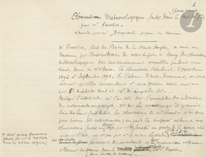 Henri BECQUEREL. — Manuscrit en partie autographe, Observations météorologiques faites dans la Haute-Sangha (Congo français) par Mr Ferrière, résumées par Mr Becquerel, professeur au Muséum, [fin 1895] ; 19pages in-4 (dont 7 autographes).