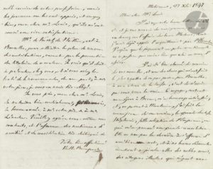 – 20 septembre 1843. Projets de mariage : «Telle dont la famille et la fortune pourraient convenir, n’est ni jeune ni jolie ; telle autre est jeune et jolie, mais sa fortune est problématique ; pour d’autres enfin, il faudrait faire des démarches, dont le résultat n’est pas certain. Je crois donc que je resterai tel que je suis, en espérant un meilleur avenir»… Il se plaint de son domestique qui l’a «trahi de la manière la plus indigne»…
