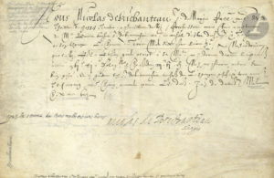 Nicolas de Brichanteau, sieur de Nangis, «Cappitaine general des Thoilles de chasses, Tantes et Pavillons du Roy», confesse recevoir de Vincent Bouhier, sieur de Beaumarchais, trésorier de l’Espargne, 3600 livres pour la pension que lui verse le Roi. Il écrit de sa main : «pour la somme de trois mille sis cens livres Nicolas de Brichanteau Nangis».