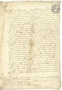 Manuscrit, Rouen, «en la cour de Parlement», 6 mai 1544. Copie d’époque faite à la requête de deux bourgeois de Falaise, Guillaume Angot et Jehan Fouquier, de l’édit du Roi François Ier rédigé à Bonport en mai 1544, attribuant de nouveau aux Vicomtes de Normandie, moyennant une somme de 45.000 livres, les greffes et sceaux des vicomtés qui avaient été réunis au domaine de la couronne (cahier de 9 p. in-fol.).
