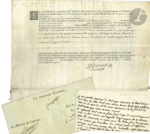 – Napoléon Bonaparte (signature du secrétaire, bas d’un document découpé avec les signatures de Chaptal et Hugues Maret).