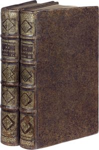 Édition originale d'une insigne rareté. Achevée d'imprimer le 2 août 1680, l'édition fut partagée entre les libraires Claude Barbin et Louis Billaine ; on trouve indistinctement l'adresse de l'un ou de l'autre sur les titres. Cette première édition est demeurée inconnue à Brunet, qui ne cite que la réédition d'Amsterdam, 1682, et Tchemerzine écrit ne l'avoir jamais vue. On en répertorie moins de dix exemplaires dans les collections publiques françaises. Ces « conversations sur la conversation » forment le premier des recueils d'essais que Mademoiselle de Scudéry publia après ses romans précieux – ulcérée, dit-on, par les railleries de Molière et la mauvaise réputation que Boileau leur faisait. La plus célèbre des précieuses y traite de la morale et des passions, de la raillerie, de l'oisiveté, de politique et de religion, mais aussi de la manière d'inventer une fable. Exemplaire des plus désirables en reliure strictement contemporaine, très grand de marges (haut. 178 mm) et en remarquable condition. L'exemplaire de la BnF comporte un frontispice gravé par Le Clerc qui ne se trouve pas dans cet exemplaire. Insensibles restaurations aux reliures, rares petites salissures éparses. Tchemerzine, V, 787 (éd. de Lyon, 1680) – Brunet, V, 251 (éd. d'Amsterdam, 1682) – Barbier, I, 757 – G. E. Reed : Claude Barbin, n°370.