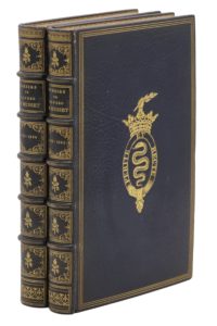 Paris, Charpentier, 1865 ; 2 vol. in-12, maroquin bleu nuit, 3 filets dorés en encadrement sur les plats, blason au centre, dos à nerfs orné, dentelle intérieure, tranches dorées sur marbrure (Trautz-Bauzonnet).Édition collective rassemblant avec soin l’œuvre poétique de Musset.