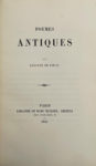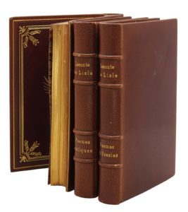 Paris, 3 vol. in-12, maroquin janséniste brun, dos à nerfs, doublures de maroquin de différents tons ornées de filets intérieurs, fleuron aux angles, lyre au centre, gardes de soie brochée vert sombre, tranches dorées sur témoins, couvertures (Marius Michel).Poèmes antiques. Paris, Marc Ducloux, 1852.- Édition originale, qui contient la préface supprimée dans les éditions suivantes. Premier recueil de l’auteur. Vélin bien blanc, il n’a pas été tiré de grand papier.