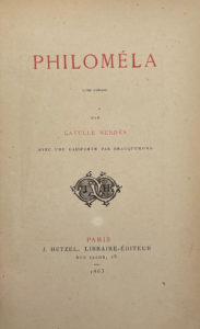 Philoméla. Paris, Hetzel, 1863  ; in-12, demi-chagrin rouge, dos à nerfs, tranches mouchetées. Édition originale du premier livre de l’auteur. Il fut le promoteur et l’historien du mouvement parnassien. Frontispice. – Envoi autographe de Catulle Mendes à Leconte de Lisle, l’un des maîtres du Parnasse : « témoignage d’admiration et de vénération profondes ».