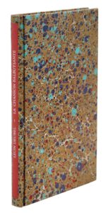 Poligny, 1899 ; in-16, bradel de papier mordoré à mouchetures multicolores, couverture vert d’eau. Édition originale très rare, tirée à petit nombre aux frais d’un auteur désargenté. C’est le premier livre de Deubel, l’un des archétypes du poète maudit. Orphelin de mère, miséreux, professant sa superbe indifférence au monde, il se jeta dans la Marne avec ses manuscrits à 33 ans. Plusieurs poètes l’ont jugé l’un des meilleurs de la période symboliste ; sa gloire progresse en douceur, notamment grâce aux soins de la bibliothèque de Belfort.