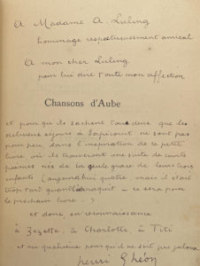 Chansons d’Aube. Paris, Mercure de France, 1897 ; in-12 demi-maroquin vermillon à coins, dos lisse, tête dorée, couverture. – Un des 10 Hollande, avec envoi autographe signé à M. et Mme Luling, pour exprimer combien leur maison et leurs enfants ont inspiré le recueil. Couverture salie.