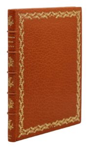 Paris, Librairie de l’Art Indépendant, 1892 ; petit in-8 carré, maroquin fauve, guirlande dorée en encadrement sur les plats, dos à nerfs orné de branchages, cadre intérieur avec branchages dorés aux angles, doublures et gardes de moire sable, doubles gardes, tranches dorées sur témoins, couverture ornementée en rouge et noir, étui (E & A Maylander).Édition originale anonyme qui fit sensation. Publiée à 23 ans et préfacée par Pierre Louÿs, elle fut tirée à 190 exemplaires seulement.