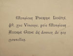 Un carton très amusant, spécialement imprimé : Monsieur Pierre Louÿs, 49 rue Vineuse, prie Monsieur André Gide de donner de ses nouvelles.