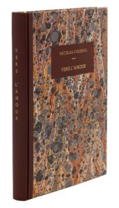 Paris, A. Wolff, 1899 ; in-8, demi-chagrin noisette à la bradel, étiquette de titre sur le plat supérieur, couverture (Patrice Goy).Édition originale du premier recueil de vers publié par Mécislas Golberg, figure tragique de la poésie, marquée par la maladie et la misère. « Ce serait une injustice à réparer que de publier la plupart des écrits, aujourd’hui introuvables, de Golberg car la richesse des suggestions, la profondeur et la force de certains points de vue y sont manifestes. » (Talvart et Place).